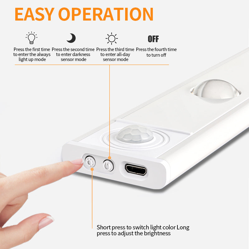 - Intelligent Motion Sensor Light: LED under cabinet lighting upgraded with infrared motion technology, more sensitive to automatically sense human motion within 10ft/120° and automatically turns off after 25 seconds of no motion. Three sensor mode settings, all-day sensor mode (light up when it senses someone), Night sensing mode (in the case of insufficient light, the induction of talent will automatically light up), and Always on mode: (cabinet light always on).